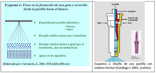 La forma de evitar esto es con boquillas hidroneumáticas (asistidas por aire, aire inducido, tipo Venturi), en las cuales las gotas salen a mayor velocidad y no quedan flotando suspendidas en el aire como las hidráulicas. En el Esquema 1 se representa lo que ocurre con las gotas que salen de boquillas hidráulicas, ya sean de abanico plano o cono lleno o hueco. En el Esquema 2 se representa el funcionamiento de boquillas hidroneumáticas.