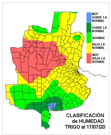 La anomalía o clasificación de humedad, es una buena herramienta para establecer zonas que potencialmente pueden resultar vulnerables a una sequía o a excesos hídricos dependiendo cómo evolucionen los pronósticos. Esto es, el margen de CB y SF, para esperar el comienzo de las lluvias de septiembre es menor que el resto del área triguera y, de nuevo, dentro de esta zona de mayor demanda, pueden darse condiciones diferenciadas, pero, a gran escala, el recorrido de estos cultivares hasta que lleguen las lluvias de septiembre se perfila bastante exigido. Por otra parte, en el núcleo triguero del sur, hay zonas que seguramente deberán lidiar con excesos, con poca lluvia los suelos tenderán a saturarse, al menos temporariamente. Si proyectamos esta condición al resto de la campaña de granos finos, el peso de la producción triguera, lo llevarán los cultivares del sur. En el núcleo triguero tributario de Rosario apuntar a los valores normales, es lo más razonable, una meta que se irá complejizando hacia el oeste.