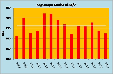 Para dimensionar esta situación, con una cotización de U$S 225 para soja mayo, en términos estacionales al 23/7 se advierte que estos valores resultan similares a los de 2010 y 2016, mientras que para encontrar un precio inferior debemos remontarnos a 2007 (en ese momento la posición mayo 2008 valía poco más de U$S 210).