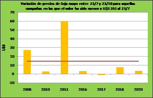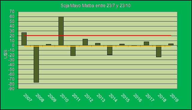 En efecto, contrastando las cotizaciones de la posición mayo entre 23/7 y 23/10, se advierte que en promedio desde 2007 se ha producido una ligera merma de U$S 1.5 (línea amarilla del gráfico 3).