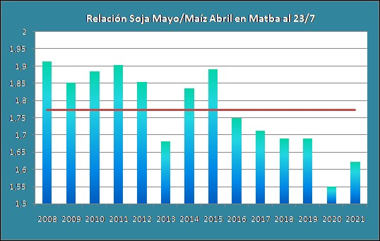 En este contexto, examinando la relación de precios soja mayo/maíz abril en la plaza doméstica, estamos ahora en niveles de 1.62, superando únicamente para esta fecha en la evolución histórica lo observado un año atrás (en ese momento el ratio era de 1.55).