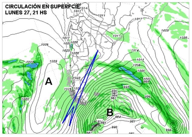 Un sistema de alta presión sobre el Pacífico Sur y otro de baja presión al norte de la península antártica, provocaron un fuerte gradiente de presión que indujo a las isobaras a desplegarse como canales que facilitaron el arribo de aire de latitudes polares. Considerando las rigurosas condiciones que ya dominaban la Patagonia, la masa de aire que llegó desde el sur, apenas sufrió modificaciones y por lo tanto, no sorprende el frío intenso de estas jornadas. El enfriamiento de ayer y hoy tuvo mayor eficiencia sobre la franja mediterránea, pero las heladas fueron generalizadas sobre toda la región productiva del centro y también sobre el oeste del NEA.