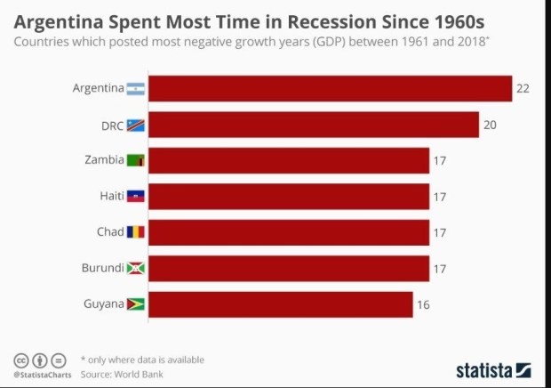 Un trabajo del año pasado en base a datos del Banco Mundial, muestra que Argentina fue el país que más tiempo estuvo en recesión entre 1961 y 2018. Estuvo en recesión 22 años de los 57 años considerados, es decir, aproximadamente el 39% de esos 57 años estuvo en recesión.