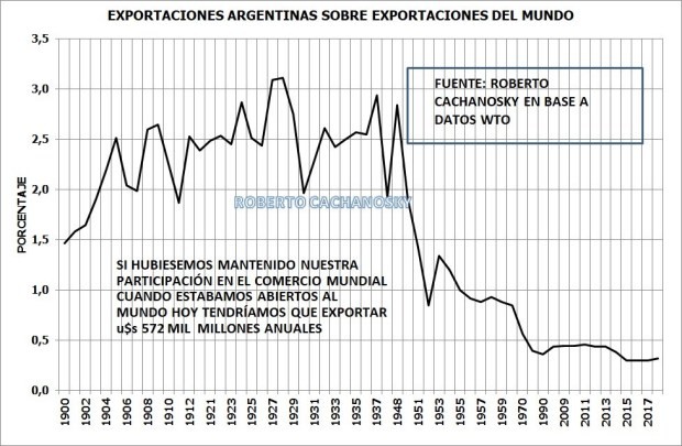 El gráfico 1 muestra claramente que entre 1900 y mediados del siglo pasado, las exportaciones argentinas representaron entre el 2 y el 3 por ciento del total de las exportaciones mundiales. A partir del momento que nos cerramos al mundo y pretendimos vivir con lo nuestro, la participación de las exportaciones argentinas sobre las exportaciones mundiales bajó hasta representar actualmente el 0,3% del total.