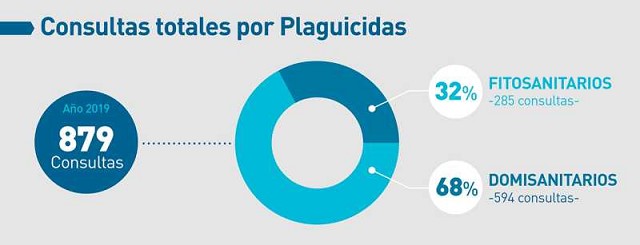 En nuestras consultas del año 2019, se pudo observar una gran diferencia entre estos dos productos, que se mantiene constante a través de los años. Se contabilizaron 879 consultas sobre plaguicidas de las cuales aproximadamente 68% estaban relacionadas con productos domisanitarios y sólo el 32%, con fitosanitarios.