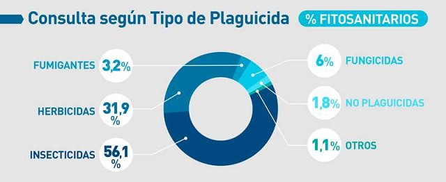 Las consultas más frecuentes por fitosanitarios son por los insecticidas en un 56,1% y dentro de este porcentaje, el 45,6% corresponde a piretroides. En referencia a los herbicidas, la consulta más habitual está dada por glifosato por ser de uso regular (37.4%), seguida por el 2,4-D(12,1%).