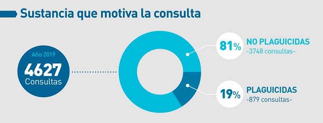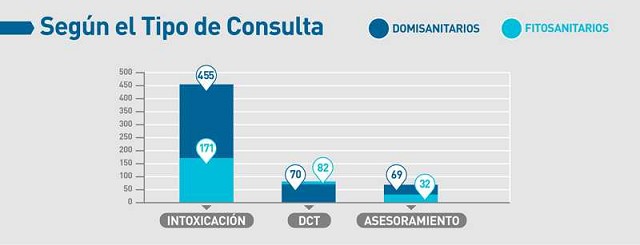 Asimismo, de la cantidad de consultas mencionadas, el 71% se realizó por intoxicaciones y el 29% restante fue para descartar causa tóxica o por asesoramiento. Un dato interesante es que, del 71% de las intoxicaciones sólo 171 fueron por productos fitosanitarios mientras que 455 fueron por domisanitarios.