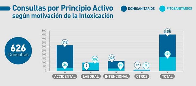 La intoxicación puede clasificarse en accidental, laboral, intencional u otra (ej. medioambiental). De un total de 626 consultas por intoxicación, 455 fueron por domisanitarios. De estas, 318 fueron por intoxicación accidental, 122 intencionales y 3 laborales. En contraste, las consultas por fitosanitarios fueron 171, de las cuales 102 fueron por intoxicación laboral, 34 accidental y 28 intencionales.