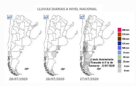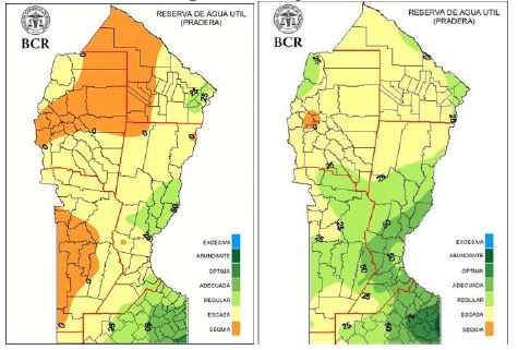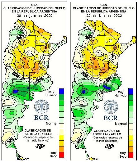 La primera imagen, la que indica sequía en gran parte de la franja oeste, refleja las reservas al 29 de julio del 2020. La de la izquierda es de hace un año; las reservas de agua en la región núcleo eran casi óptimas y sólo escaseaban en forma leve en el sudeste de Córdoba, Chaco y Santiago del Estero. El Pacifico Ecuatorial Central se alineaba a favor y los mecanismos de escala local promovían acumulados levemente por encima de las normales para el norte del país