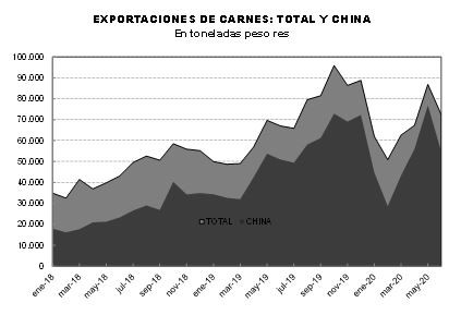 ¨Nuevamente, el mercado chino fue determinante en la evolución de nuestras exportaciones de carnes, con una merma de más de 15 mil toneladas respecto del récord histórico verificado en el mes de mayo, la cual fue compensada parcialmente por una mejora en los embarques de carnes enfriadas y con la reaparición de Israel y la incorporación de Estados Unidos como mercado relevante en el rubro del congelado¨, agregó Ravettino.