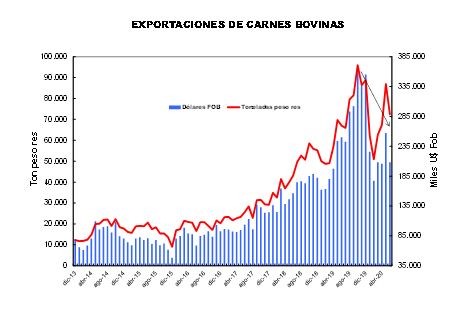 Durante junio de 2020, las exportaciones de carnes congeladas sumaron 44 miles de toneladas peso producto por valor de 168 millones de dólares, el 87% del monto total facturado en concepto de carnes bovinas. En relación con el período precedente, se registraron bajas del 20 y 25%, en volumen y valor respectivamente.