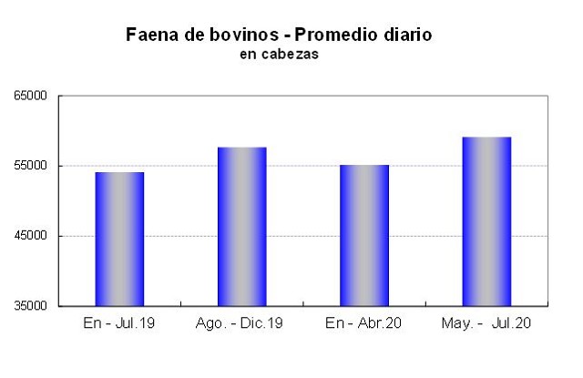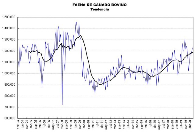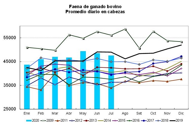 La faena registrada en julio de este año fue elevada comparada con los registros de los últimos años, 12% mayor a la de doce meses atrás, aunque inferior a julio de 2019 y al promedio registrado en el quinquenio 2005-2009. Al extender el análisis al acumulado en el ciclo 2019/20 cerrado en el mes de julio, se observa que en relación con la media de 2005-2009, es un 2% menor.