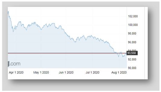 El gráfico que sigue muestra claramente cómo desde abril el dólar en términos de una canasta de las principales monedas viene en baja. Con pequeños altibajos, pero el declive es firme.
