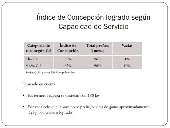 Por lo tanto, para que los toros de Alta y Muy Alta CS concentren la preñez, el rodeo de vacas debe estar sano y ciclando debido a una adecuada alimentación. Estas dos categorías de toros, sirven a las vacas en celo 2, 3 o más veces, y esa cantidad de servicios (en ese celo), aumenta la chance de que la vaca se preñe al comienzo del entore.
