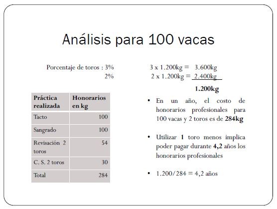 En la ilustración que a continuación se transcribe se pretende demostrar, que disminuyendo de un 3 al 2% el porcentaje de toros , en un rodeo de 100 vacas, y considerando el valor histórico de un toro a 1.200 Kg. de novillo (390-430 Kg) del Mercado de Liniers y expresando los honorarios profesionales en Kg. del mismo novillo, le permitiría al criador, con el ahorro, abonar los honorarios del tacto rectal, sangrado, revisación de los toros con doble raspaje y Prueba de CS de los mismos durante 4,2 años (no contemplamos gastos de laboratorio y viáticos). Si este mismo ejercicio lo hacemos con un toro cuyo valor es de 1.000 Kg el ahorro alcanzaría para pagar los honorarios citados durante 3,5 años, y si el valor del toro fuese de 1.500 Kg alcanzaría para 5,3 años.