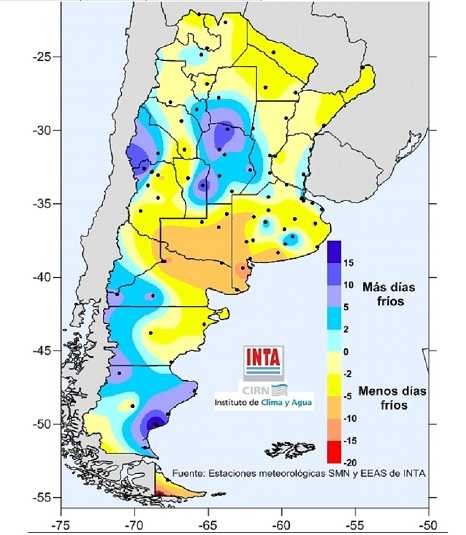 Asimismo, hasta el 31 de julio y respecto de los valores medios históricos, el análisis del INTA indicó que hubo un mayor número de días con heladas sobre Córdoba, este de San Luis, sur de Santiago del Estero, sur de Catamarca, San Juan, noroeste de Mendoza, oeste de Neuquén, Río Negro, Chubut, Santa Cruz y algunas áreas puntuales de la provincia de Buenos Aires.