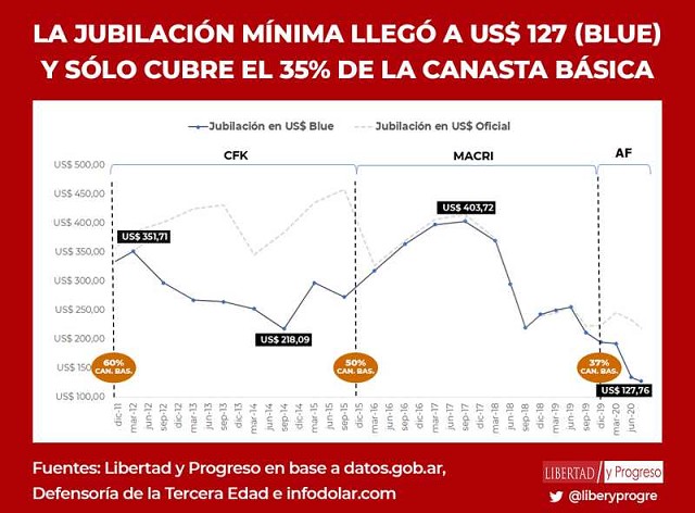En la última presidencia, la jubilación mínima alcanzó un pico de US$403. Sin