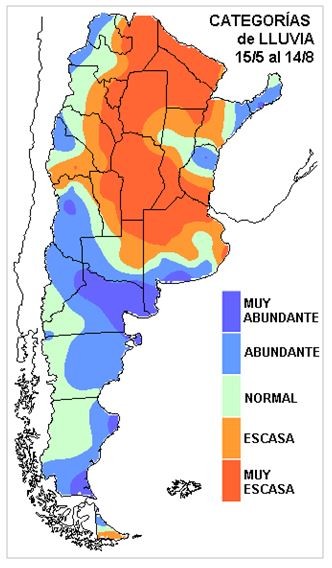 El norte de BA, también queda incluida dentro de esta fuerte anomalía, sin embargo y al igual que el sudoeste entrerriano, las lluvias fueron algo mejores, lo cual da algo de margen para transitar lo que resta de agosto. El comportamiento deficitario avanza hasta el centro de BA, moderándose hacia el sur, donde la anomalía invierte su signo, algo que sólo se repite en zonas del norte entrerriano o el extremo noreste de la Mesopotamia. Como vemos, el invierno en el NEA, tampoco ha dejado las escasas precipitaciones que define la estadística, generando en la zona sojera-algodonera de Chaco, Santiago y el noroeste de SF, una fuerte retracción de humedad, posiblemente con algunas excepciones en el sudeste de SdE.
