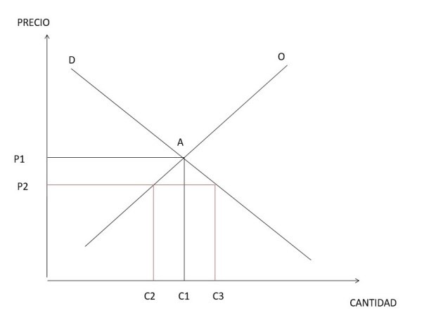 El gráfico 1 muestra dos simples curvas. Una de oferta O y otra de demanda D. El mercado actuando libremente está en equilibrio en el precio P1 y gente hace transacciones en la cantidad C1.