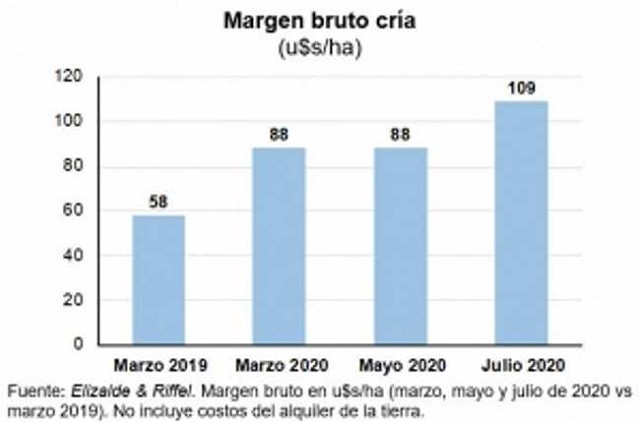 Durante este año, tal como muestra el gráfico, los resultados económicos de la cría mejoraron en forma significativa (marzo 2020 vs marzo 2019) e incluso se vieron más favorecidos durante los últimos meses (julio 2020) por el aumento en el precio del ternero.