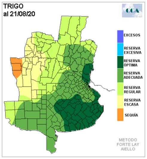 El balance hídrico para trigo diferencia, a gran escala, los dos núcleos trigueros, con distintas situaciones en su tránsito hacia el mes de septiembre. En el núcleo triguero tributario de Rosario, siguen marcadas las diferencias este oeste, aunque es claro que de mantenerse este comportamiento pluvial el deterioro, terminará afectando las zonas del norte bonaerense y sudoeste entrerriano más temprano que tarde. En este sentido, las lluvias de mediados de la semana próxima son vitales para dar el próximo paso en la evolución y el estado de los cultivos de la fina.
