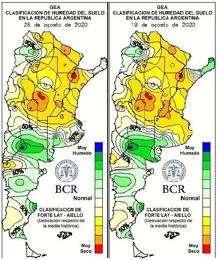 La esperanza de detener la perdida de lotes de trigo estaba puesta en la lluvia de esta semana y ahora se estima que un 12,5% de lo sembrado con trigo pase en poco tiempo más a darse por perdido. Se trata de un gran golpe productivo para la región, en general solo suelen perderse 30 mil ha, casi 7 veces menos. Hace dos años, en la 2018/19 hubo un valor de referencia que se aproxima a este nivel de daño: se perdieron 118 mil ha. Pero en ese año el 75% se perdió por granizo. Agosto del 2020 termina con el 25% del trigo de la región comenzando a encañar; la capacidad de recuperación del cultivo es cada vez menor. Y los pronósticos no muestran en el corto plazo la posibilidad de revertir la situación. Para este fin de semana, se esperan condiciones inestables pero que difícilmente produzcan lluvias.