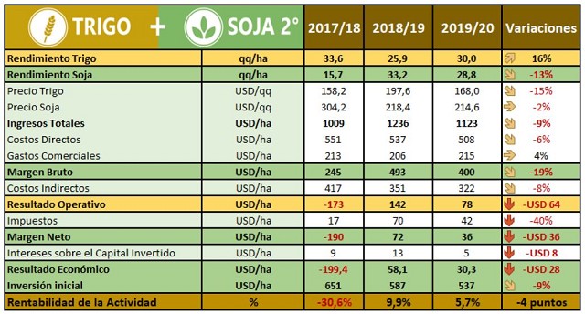 Con respecto al planteo combinado de trigo y soja de segunda, los resultados se han mostrado positivos para el promedio departamental, pero menores a los de la campaña previa. La tasa de rentabilidad se ubicó en 5,7%, con una caída de 4 puntos básicos. El resultado económico fue de USD 30,3 por hectárea, representando un recorte de USD 28/ha.
