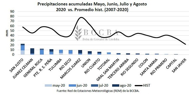El panorama climático para esta campaña viene siendo complicado para todo el territorio de la provincia. Si se observa el grafico a continuación, se aprecia el gran déficit hídrico que hubo en los meses de mayo, junio, julio y agosto en contraste al promedio histórico, que en promedio para la provincia para este cuatrimestre es de 45 mm.