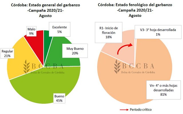 Para esta leguminosa invernal se estima una superficie implantada de 17.800 ha, de las cuales un 30% presenta estados regulares y malos (más de 5.000 ha). Un 70% se mantiene en buenas condiciones gracias a que el garbanzo, en general, afronta mejor que el trigo a la sequía.
