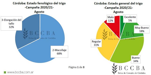 Trigo. De las 1.264.300 ha de trigo sembradas, un 43% presenta condiciones regulares a malas debido principalmente a la falta de agua, pero también a daños por heladas. Por el momento un 68% del área transita el macollaje y un 32% más avanzado comenzó la encañazón.