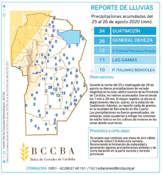 Las ultimas precipitaciones registradas fueron los días 25 y 26 de agosto, hacia el centro y sudeste de la provincia que fueron desde 1 mm hasta 34 mm en la localidad Guatimozín. Si bien las mismas ayudan a mitigar los síntomas de estrés hídrico de los cultivos, son necesarios nuevos registros en toda la provincia para la definición de rendimientos y para evitar pérdidas.