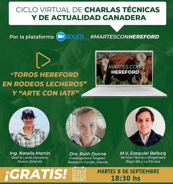 Continuando el ciclo de charlas técnicas y de interés ganadero que viene realizando las Asociación Argentina Criadores de Hereford desde principios de mayo, el próximo martes 8 la temática será muy especial: en primer término, dos técnicas invitadas se referirán a experiencias y resultados del uso de toros Hereford en rodeos lecheros en Nueva Zelanda e Irlanda, países en los cuales se trata de una práctica muy utilizada en los tambos para mejorar la cantidad y sobre todo la calidad carnicera de los terneros machos.