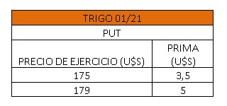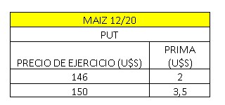 Si por el contrario, no tenemos un sentimiento de venta a corto plazo y nuestra decisión es tener mercadería en nuestro haber, sería bueno barajar la posibilidad de realizar coberturas con opciones puts para maíz en el mes de diciembre tomando como referencia los siguientes precios de ejercicio y costos: