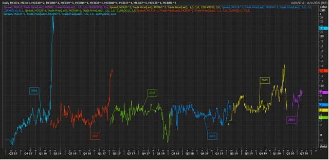 También podemos aprovechar la condición de maíz entrega marzo/abril a fijar por Matba-rofex julio más 10 U$S/tn. Sobre todo considerando que el pase promedio entre ambas posiciones de las ultimas 5 campañas estuvo en valores de 4,8 U$S/tn.