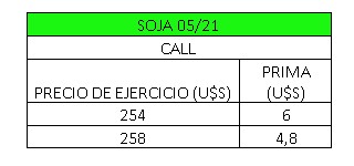 Podemos recomendar armar estrategias de venta Forward atada a opciones call de soja 05/21, con lo cual compraríamos opciones call y esperaríamos el desenlace de la niña con una cobertura en el precio del negocio realizado.