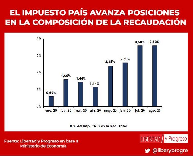 El Impuesto PAIS, que grava en un 30% las compras de dólares, empieza a ganar terreno. Desde su origen, en enero de este año, representaba apenas el 0,6% de la recaudación. El nuevo impuesto provocó un aumento de la brecha entre el dólar oficial y los paralelos, con un aluvión de ahorristas por el último. Esta enorme demanda de dólares oficiales produjo un incremento de la recaudación del impuesto PAIS. En julio, 3,9 millones de personas compraron dólares y en agosto se espera que la cifra haya superado los 4 millones.