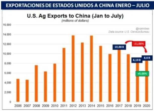 Las Exportaciones Agrícolas Totales desde Estados Unidos a China durante el período Enero-Julio han sumado U$D 8.600 Millones, un 5% más que en 2019 pero 21% por debajo de 2017. Claro que restan los registros de los segundos 6 meses del año. Se observan semanales crecimientos en las exportaciones desde Estados Unidos a China para el año comercial 2020/21. El rumbo es el correcto, el destino aún se ve lejano.