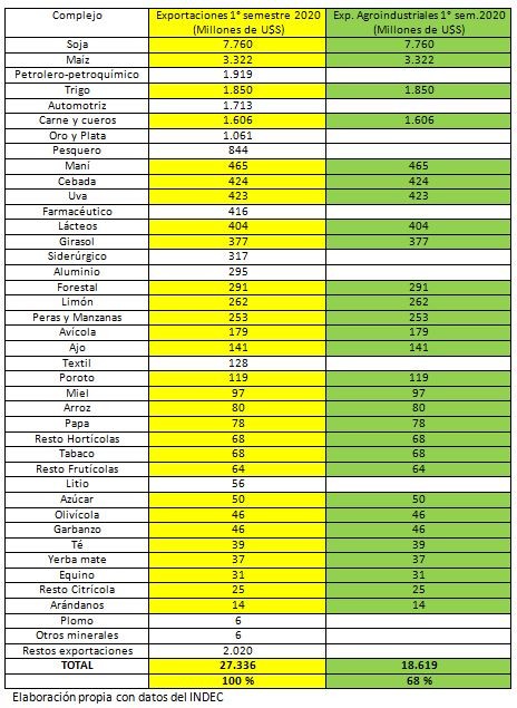 Las exportaciones totales del país en el primer semestre del 2020 fueron U$S 27.336 millones, de los cuales el 68 % (U$S 18.619 millones) corresponde al sector Agroindustrial.
