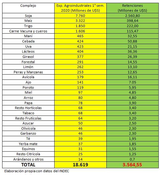 Si analizamos las exportaciones por complejos agroindustriales, observaremos que la generación de dólares se da por producciones distribuida a lo largo y ancho de todo el país. Si calculamos el aporte de dichos complejos por el derecho de exportación (retenciones), el mismo en el primer semestre del 2020 superó los U$S 3.500 millones. Dinero del interior productivo que fue a parar a las arcas del Gobierno Central.