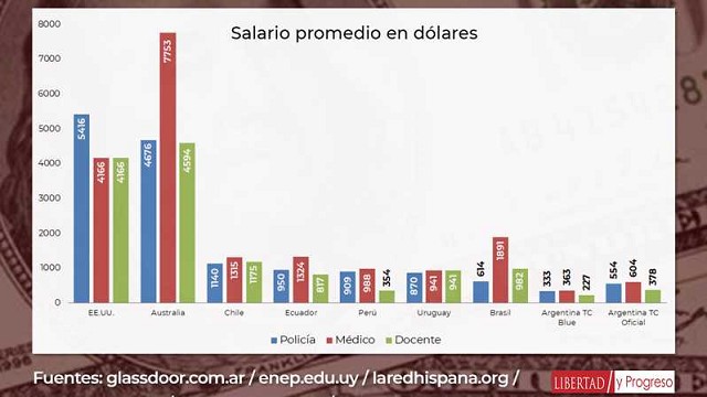 En Argentina el sueldo promedio de un trabajador de un servicio esencial es en promedio 50,4% inferior con respecto a la región y 14,7% con respecto a Estados Unidos. En el caso de los docentes la diferencia es de 44,3% en detrimento de los argentinos. Los salarios de los médicos, los policías y los docentes representan entre el 9 y el 14% de los salarios en Estados Unidos y entre el 8 y el 12% de los salarios de Australia.