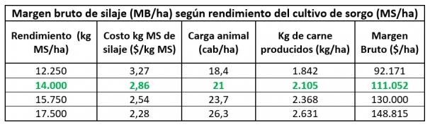Para ampliar el horizonte, se comparó un buen rendimiento de silaje de sorgo (14.000 kg/MS/ha) con igual rinde y calidad de silaje de maíz, para el mismo nivel de producción de carne. Con la diferencia de costos entre ambos cultivos (2,86 $kg/ MS en sorgo vs 3,36$kg/ MS en maíz), bajó el MB de 111.052 $/ha a 104.052 $/ha, respectivamente.