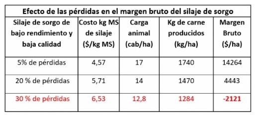 Por último, se consideraron situaciones de bajo rendimiento (8750 kg/MS/ha) y baja calidad (58% de digestibilidad), frecuentes de observar a campo, con distintos niveles de pérdidas (hasta el 30%), también usuales en el proceso de producción, extracción y suministro. Estas condiciones, como se nota en el siguiente cuadro, no sólo afectan los costos del silaje (suben de $4,57kg/MS a $6,53kg/MS), sino también la producción de carne (baja de 1740 kg/ha a 1284 kg/ha). Por lo tanto, disminuyen los márgenes brutos que, en el peor de los casos, llegan a tornarse negativos (caen de $/ha 14.624 a -2.121 $/ha). Una muestra de que la calidad en los procesos no se puede negociar.