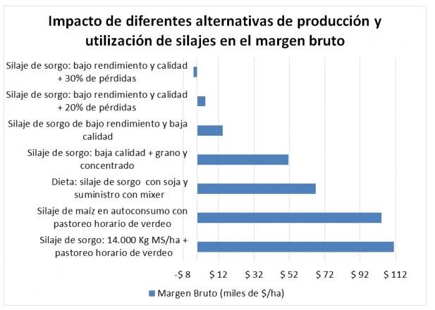 Según las alternativas utilizadas, se registra una gran disparidad de resultados que van desde 148.000 $/ha a -2.000 $/ha. Este valor negativo, como se mostró, se da con baja producción (8.750 kg/MS/ha), baja calidad (58% digestibilidad) y alto nivel de pérdidas (30%).