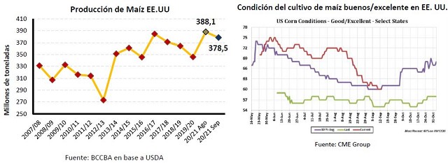 En su último informe, el Departamento de Agricultura de los Estados Unidos proyectó la producción norteamericana en 378,5 millones de toneladas, casi 10 millones de toneladas menos que lo reportado en agosto, pero por encima de lo esperado por el mercado. La caída en el volumen a cosechar obedece a menores rendimientos esperados como consecuencia de un persistente tiempo caluroso y seco, sumado a tormentas severas durante el desarrollo del cultivo a lo largo del cordón maicero. De esta manera, el rendimiento promedio sería de 112 quintales por hectárea, 2 quintales menos que los estimados en el reporte previo.
