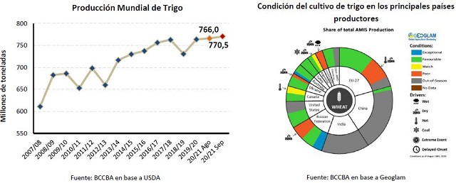 La producción mundial estimada de trigo para la campaña 2020/21 se mantiene en un nivel récord de 770,5 millones de toneladas. El incremento esta explicado por las mayores cosechas de Canadá, Unión Europea y Australia que compensa un menor volumen en Argentina. Sin embargo, en la Unión Europea persisten los problemas de sequía, afectando el volumen final a cosechar.