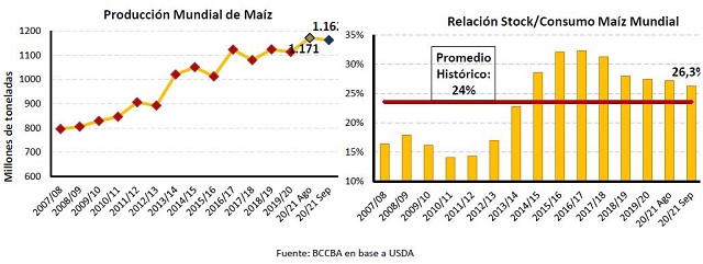 A nivel mundial, la producción de maíz se estima en 1.162 millones de toneladas, 9 millones de toneladas por debajo de la estimación previa. Sin embargo, a pesar de que aún se mantiene en un nivel récord, el consumo y las exportaciones globales también son las mayores de la historia, presionando sobre las existencias finales que cayeron al valor más bajo de las últimas seis campañas. Por este motivo, la relación stocks/consumo caería nuevamente, y sería la más baja de las últimas siete campañas, demostrando la robustez de la demanda sobre la oferta, al igual que en el caso de la oleaginosa.