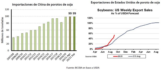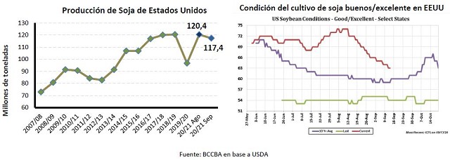 Uno de los datos más relevantes del último reporte del Departamento de Agricultura de los Estados Unidos fue la estimación de producción de este país para la campaña 2020/21, que se ubicó en 117,4 millones de toneladas, lo cual implica un recorte de 3 millones de toneladas en relación con lo estimado en agosto. El menor volumen por cosechar obedece a una caída en los rendimientos, que alcanzarían los 34,9 quintales por hectárea. A finales de septiembre comenzará la cosecha, que se extenderá hasta principios de noviembre, y comenzarán a corroborarse las distintas estimaciones.