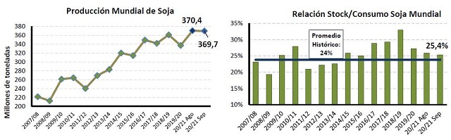 A nivel mundial, la oferta de oleaginosa para la temporada 2020/21 sería récord con un valor 369,7 millones de toneladas, lo cual representa un aumento de casi 33 millones de toneladas frente a la campaña 2019/20. Por el lado de la demanda, el consumo mundial y las exportaciones alcanzarían sus mayores valores durante el ciclo actual, lo cual se traduce en una caída en las existencias finales. De esta manera, la relación stocks/consumo a nivel mundial caería a su nivel más bajo de las últimas cinco campañas, posicionándose levemente por encima del promedio histórico. Esta situación genera un sostén para los precios de la oleaginosa y brinda sustento a nuevas subas si aparecen problemas por el lado de la oferta.