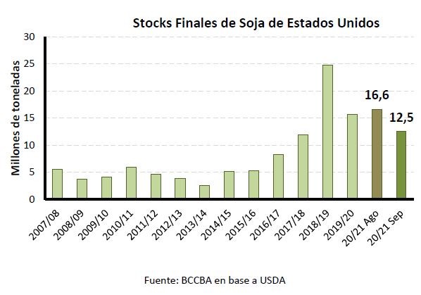Como consecuencia de la menor producción esperada, los stocks norteamericanos comenzaron a recortarse, y se ubicarían hacia el final de la campaña en 12,5 millones de toneladas, lo cual representa una merma 3 millones de toneladas para el ciclo anterior y de poco más de 4 millones de toneladas respecto al reporte previo.