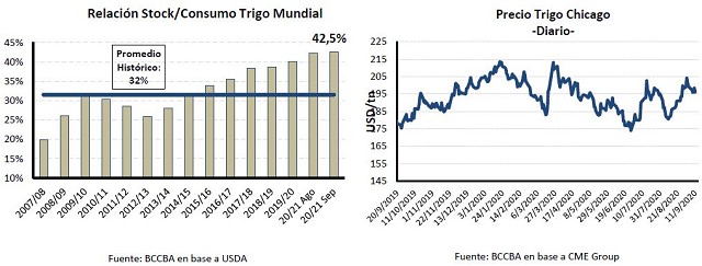 La relación stocks/consumo a nivel mundial, se ubica en el mayor valor de la historia, lo cual refleja una situación de oferta holgada y limita las posibilidades de suba del cereal.